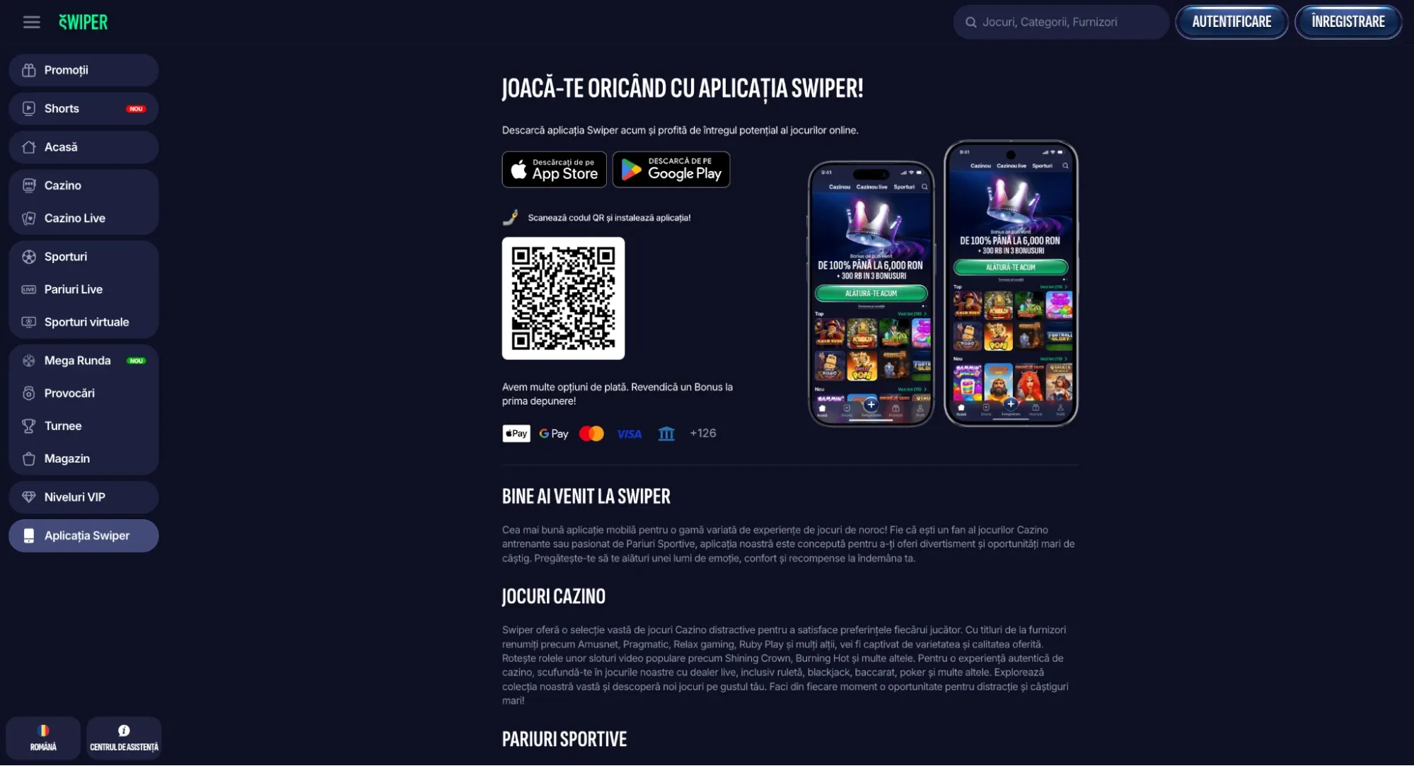 Swiper.ro oferă o aplicație nativă pentru iOS (App Store) și Android (APK de pe swiper.ro). Funcționalitate completă: sloturi, pariuri, depuneri, retrageri și bonusuri. Alternativ, platforma funcționează integral și din browserul mobil, fără descărcare.