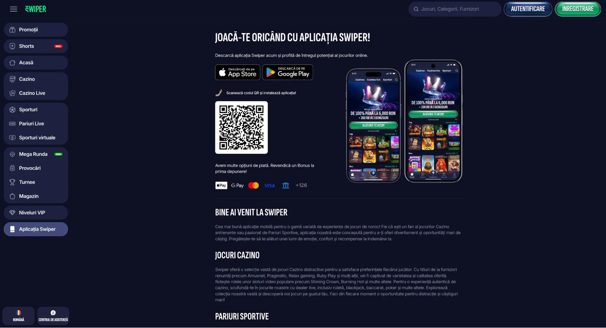 Swiper.ro dispune de o aplicație mobilă nativă disponibilă pe iOS (App Store) și Android (Google Play). Aplicația oferă acces complet la cazino, cazino live, pariuri sportive și toate funcționalitățile platformei.