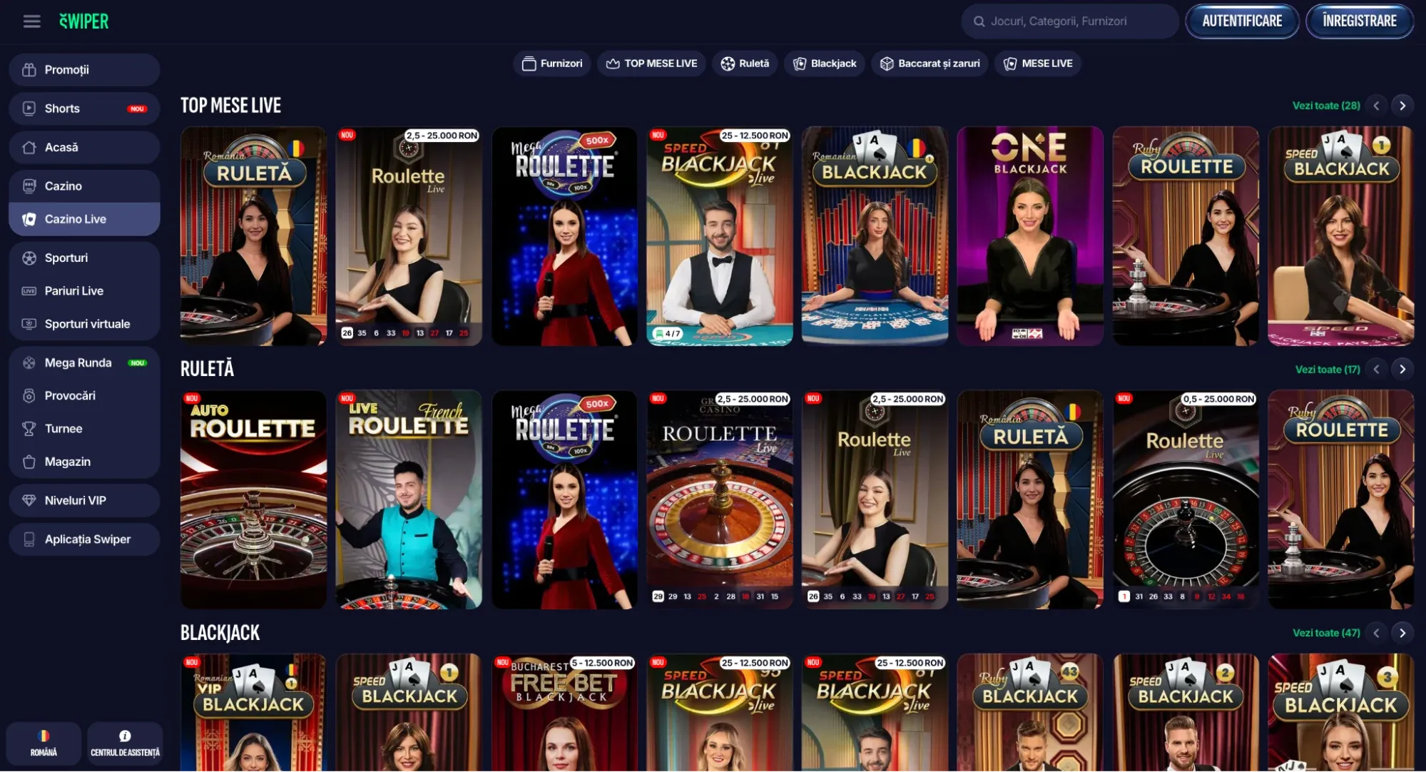 Mize: 0,5 – 25.000 RON. Include: Auto Roulette, Live French Roulette, Mega Roulette 500x, Grand Casino Roulette, România Ruletă (dealer vorbitor de română), Ruby Roulette și altele. Ghid detaliat: ruletă online Swiper.