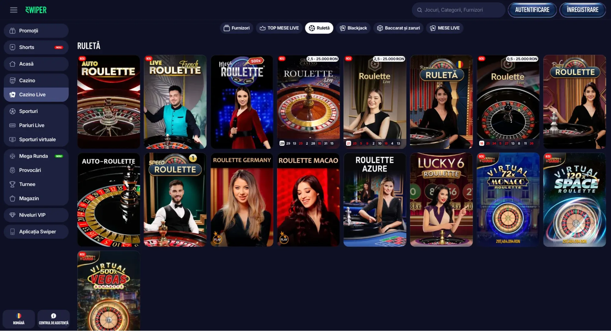 Mizele variază de la 0,5 RON (Auto-Roulette) până la zeci de mii de RON la mesele VIP. Ghidul complet al secțiunii de jocuri cu dealeri reali este disponibil în Live Casino Swiper.